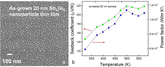 20 nm Sb2Te3 nanoparticles directly synthesized by CVD method showed a higher Seebeck coefficient compared to the larger size nanoparticles (50nm and 100nm).9 Although the conductivity decreased a little, the smaller size particle still demonstrated a higher power factor.