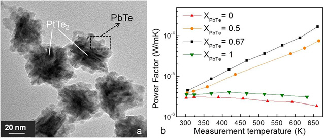Figure 3. (a) TEM image of PbTe-PtTe2 binary phased nanoparticles with phase ratio XPbTe = 0.5. (b) Enhancement of power factor in PbTe-PtTe2 binary phased nanoparticle samples with various XPbTe values.