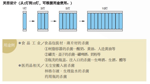 可在短時(shí)間內(nèi)進(jìn)行包裝材料或食品等表面殺菌的強(qiáng)力紫外線殺菌裝置。與以往的硬質(zhì)玻璃制低輸出殺菌燈相比,具有數(shù)十倍(與本公司相比)的殺菌能力,黑霉菌和耐性強(qiáng)的細(xì)菌也可在數(shù)十秒內(nèi)消滅。